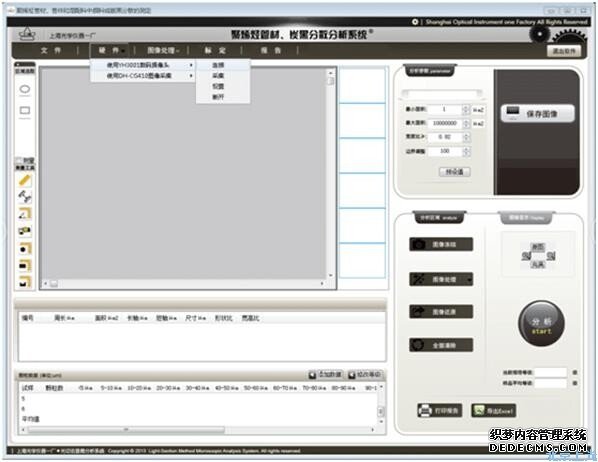 軟件采用數(shù)字?jǐn)z像頭對(duì)圖像進(jìn)行采集。它具有先進(jìn)的電腦測(cè)量系統(tǒng),界面簡(jiǎn)潔,操作方便,通過(guò)點(diǎn)擊分析按鈕就可以自動(dòng)得出圖像里的任意顆粒的數(shù)據(jù),測(cè)量方便,減少了人為誤差,大大提高了測(cè)量精度